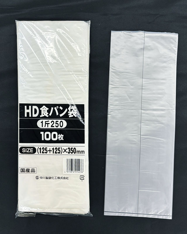 HDPE製の食パン1斤用袋です。PP食パン袋と比べ、半透明調の風合いがあり、差別化できます。安心安全の国産品です。