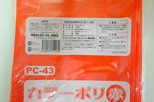 45リットルカラーポリ袋シリーズの赤色タイプ。柔らかい素材LLDPEでしっかりした厚みがあります。分別用ゴミ袋として学校などで使われています。また催し物の工作にも人気です。