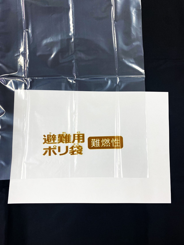 第3者機関にて行ったJIS規格「薄い材料の防炎性試験方法」の防炎1級に適合したポリ袋です。