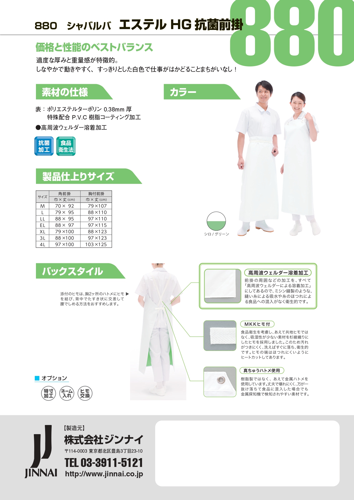 880-WLK エステルHG抗菌前掛【白|Lサイズ角】厚みのある生地/コストパフォーマンス〇/高周波ウェルダー溶着加工/ヒモ付け替え可能