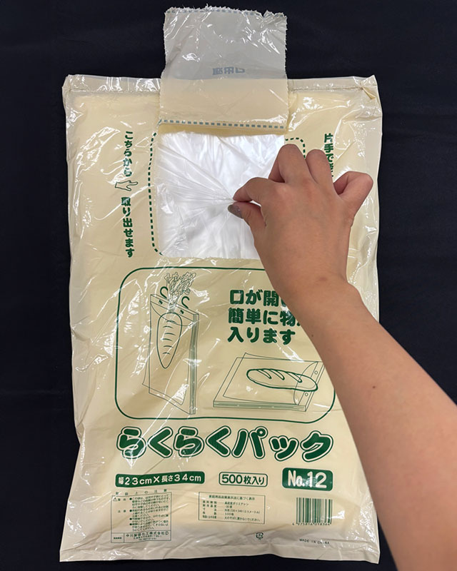 No. 12/らくらくパック/HDPE製の極薄タイプの袋です。ブロックシールになっており、ミシン目から簡単に1枚づつ取り出せるため、作業効率が上がります。製品上部に穴が3ヶ所開いているので、フックがあればどこでも掛けて使用できますし、平置き使用も可能です。業務用だけでなく、家庭でも便利に使えます。