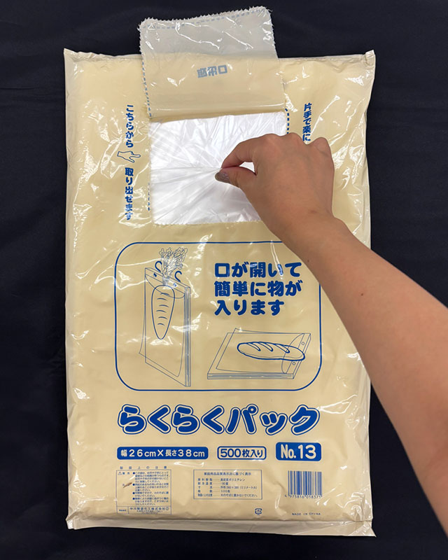 No. 13/らくらくパック/HDPE製の極薄タイプの袋です。ブロックシールになっており、ミシン目から簡単に1枚づつ取り出せるため、作業効率が上がります。製品上部に穴が3ヶ所開いているので、フックがあればどこでも掛けて使用できますし、平置き使用も可能です。業務用だけでなく、家庭でも便利に使えます。