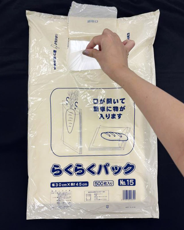 No. 15/らくらくパック/HDPE製の極薄タイプの袋です。ブロックシールになっており、ミシン目から簡単に1枚づつ取り出せるため、作業効率が上がります。製品上部に穴が3ヶ所開いているので、フックがあればどこでも掛けて使用できますし、平置き使用も可能です。業務用だけでなく、家庭でも便利に使えます。