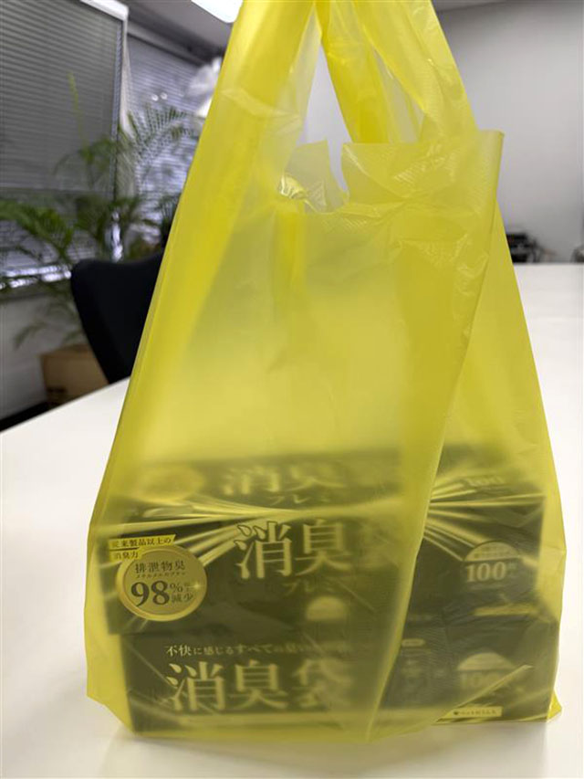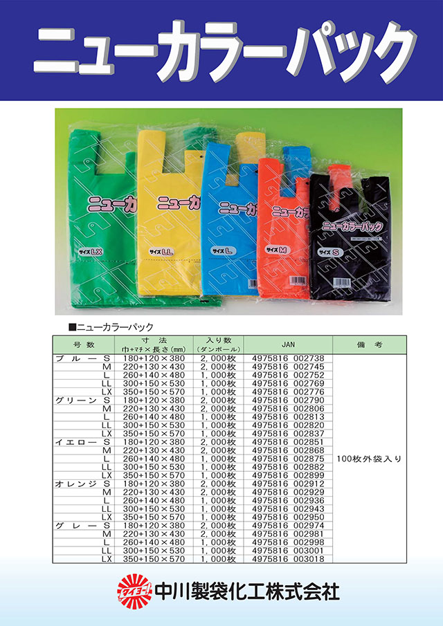イエローM/ニューカラーパック/HDPEにイエローの着色を施したレジ袋です。ブロックシールタイプで、エンボス加工を施し、開口製も優れています。催事・季節・用途等に応じて他の着色とお使い分け下さい。