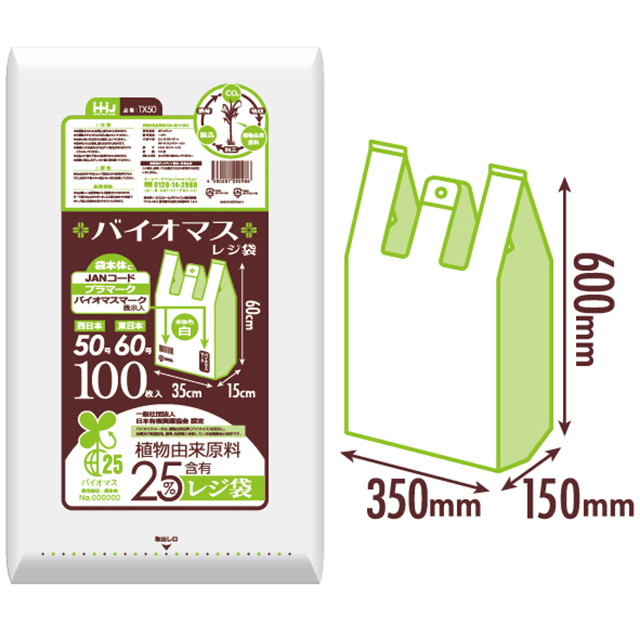 バイオマスプラスチックを25%使用し、無料配布対象になるレジ袋です。