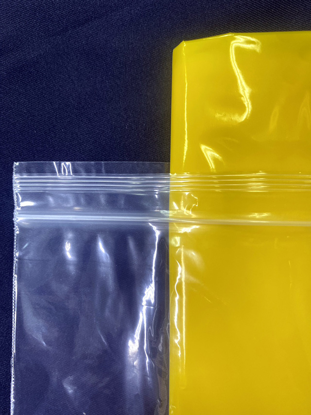 透明無地のチャック袋です。A3サイズの用紙が折らずに入るサイズです。既存品のCL-4に比べて、開口部に段差があるので、開けやすいのが特徴です。既存品の製品とカット方法にも違いがあり、側面部分の手触りがギザギザとしています。